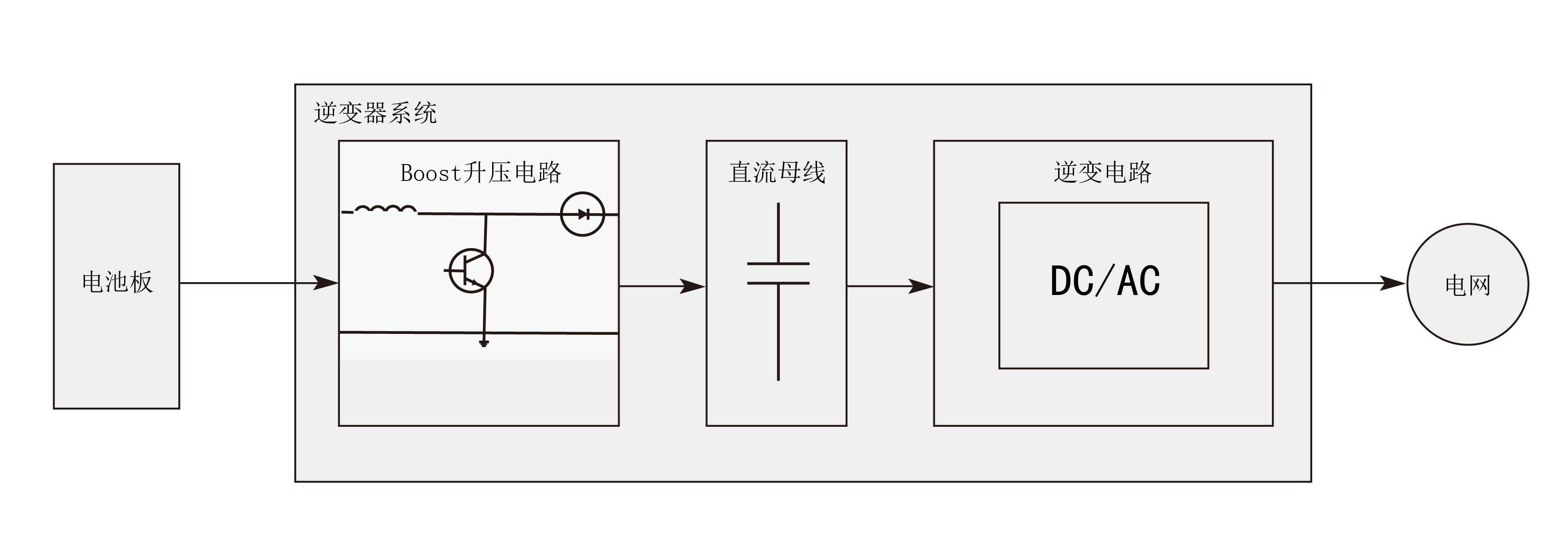 首先我們一起看一個(gè)市場(chǎng)上常見(jiàn)的逆變器系統(tǒng)構(gòu)成,有boost升壓電路、逆變電路構(gòu)成,中間通過(guò)直流母線連接。
