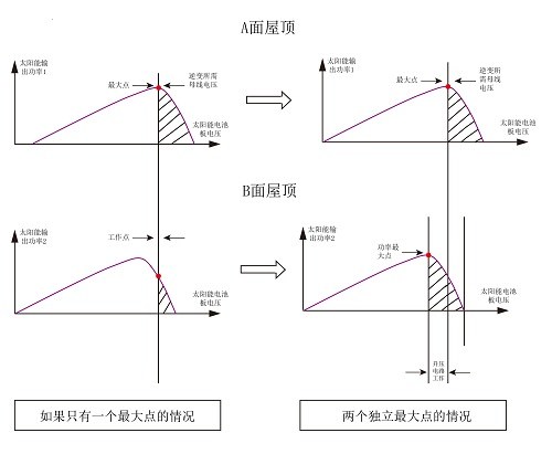 例如一個(gè)6kw的系統(tǒng),分別3kw到兩個(gè)面的屋頂,此時(shí)必須選用兩路MPPT的逆變器,因?yàn)橛袃蓚€(gè)獨(dú)立的最大工作點(diǎn),上午太陽(yáng)從東面升起,直接照射在A面太陽(yáng)能電池板上,A面的電壓和功率很高,此時(shí)B面的就低了很多,下午則相反。在兩路電壓有差異時(shí),電壓低的一路必須要通過(guò)升壓,才能將能量輸送到母線上來(lái),保證自身工作在最大功率點(diǎn)。