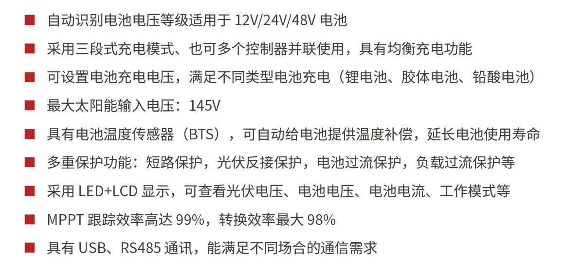 應用領域: 應用于太陽能系統(tǒng)、監(jiān)控系統(tǒng)、中小型通訊基站供電系統(tǒng)、太陽能直流供電系統(tǒng)。