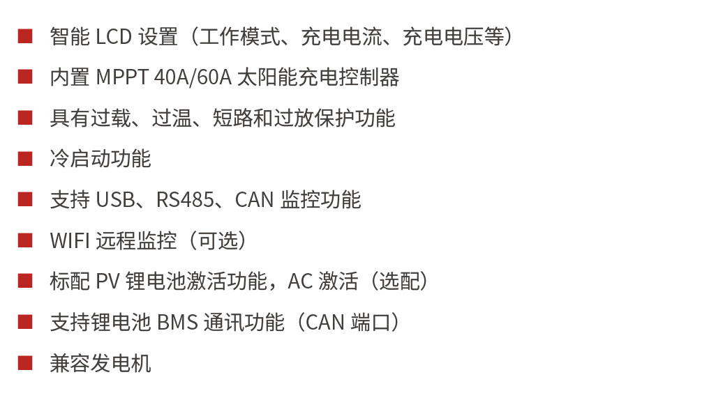 PV1800 VPM II 系列是一款正弦波離網(wǎng)逆變控制一體機、內置 40A/60A 的 MPPT充電控制器,具有市電充電、旁路輸出的功能,為負載提供不間斷電源供應。用戶可通過屏幕設置鍵設置各項參數(shù)及各類工作模式。
