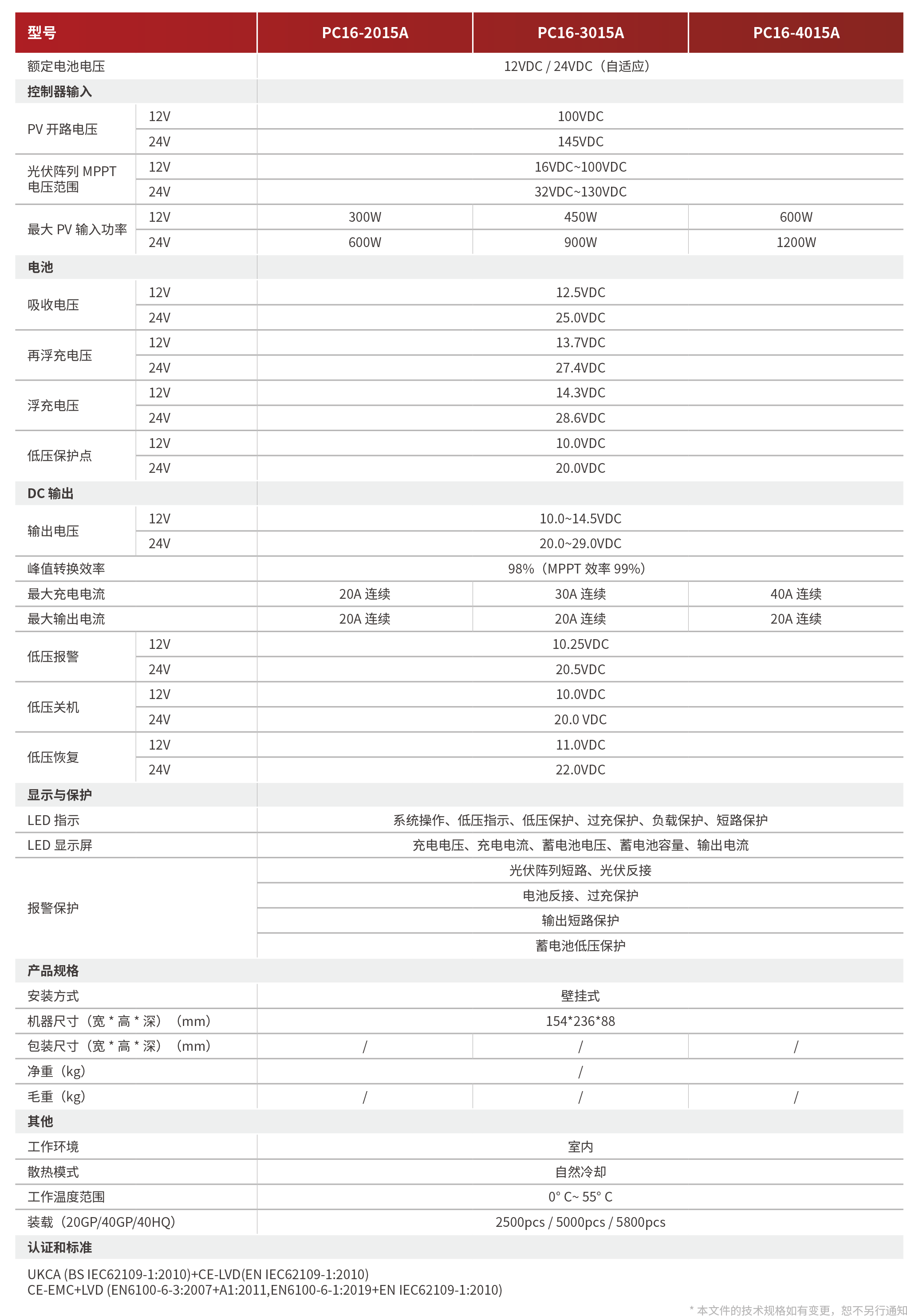 PC 系列是一款 MPPT 充電控制器,具有高效 MPPT 控制算法,在任何環(huán)境下能快速追蹤到光伏陣列的最大功率點,大幅度提高了太陽能的利用率。應(yīng)用于太陽能系統(tǒng)、監(jiān)控系統(tǒng)、中小型通訊基站供電系統(tǒng)、太陽能直流供電系統(tǒng)。