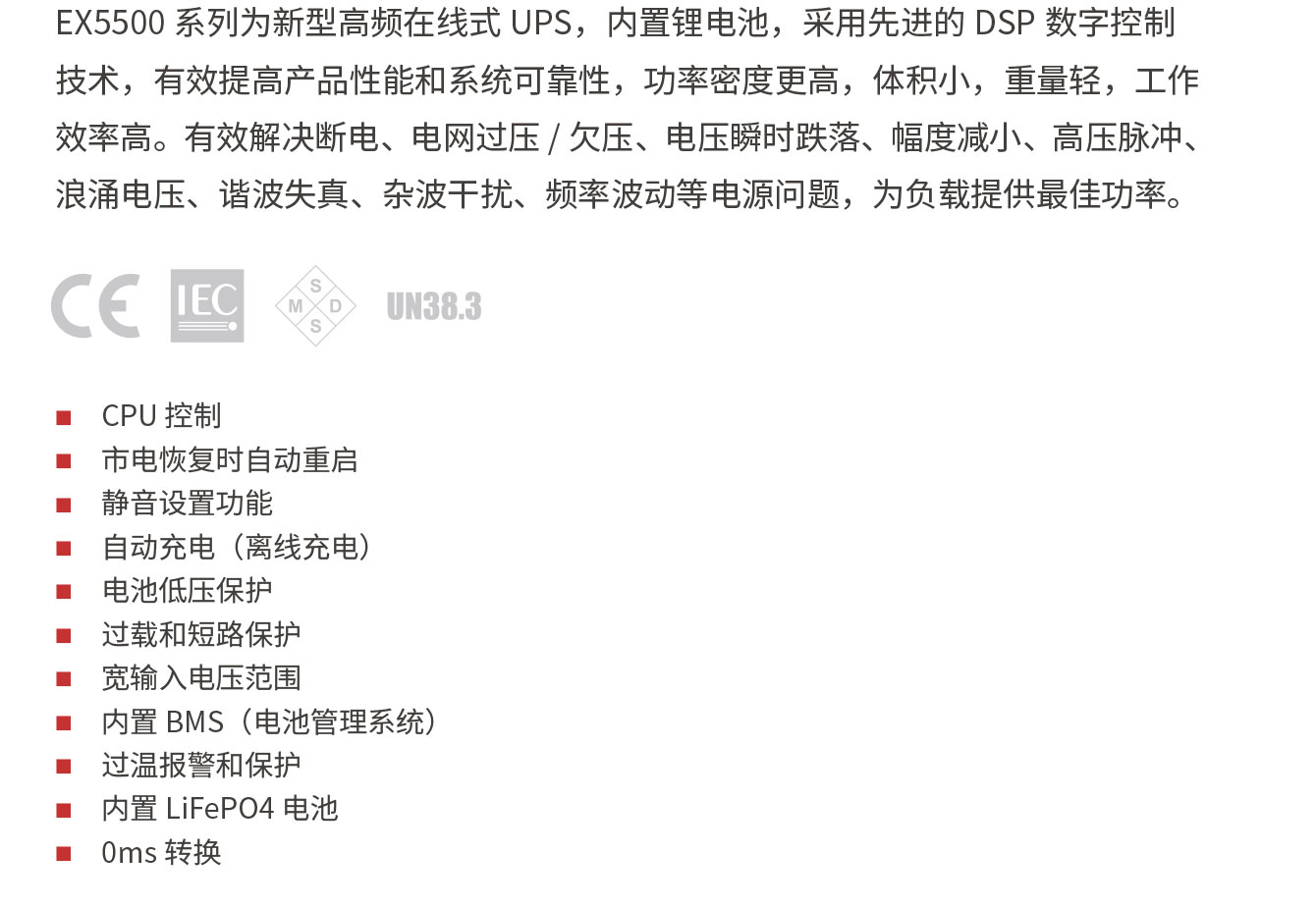 EX5500 系列為新型高頻在線式 UPS,內(nèi)置鋰電池,采用先進(jìn)的 DSP 數(shù)字控制技術(shù),有效提高產(chǎn)品性能和系統(tǒng)可靠性,功率密度更高,體積小,重量輕,工作效率高。