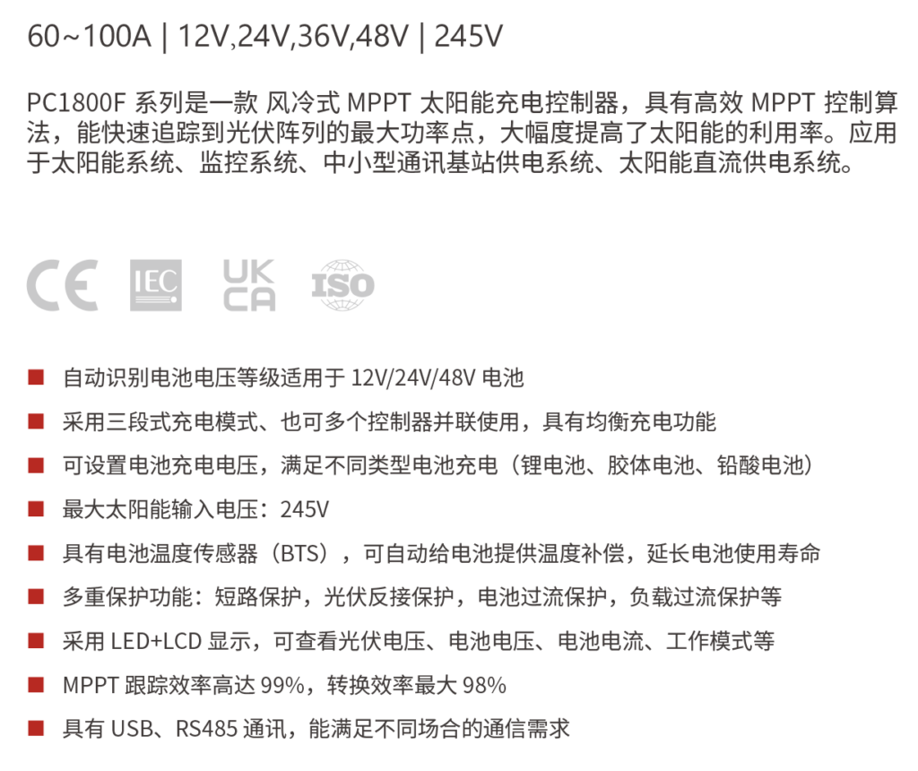 PC1800F 系列是一款 風(fēng)冷式 MPPT 太陽能充電控制器,具有高效 MPPT 控制算法,能快速追蹤到光伏陣列的最大功率點(diǎn),大幅度提高了太陽能的利用率。