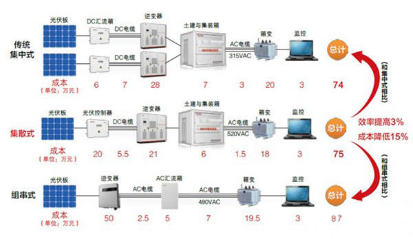 組串式逆變器方案中,將逆變器和匯流箱的全部功能都轉(zhuǎn)移至“匯流箱”,將“傳統(tǒng)匯流箱”大幅升級(jí)為“組串式逆變器”;