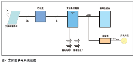 通信基站太陽能供電系統(tǒng)由光伏組件、陣列支架、匯線盒、充放電控制器、蓄電池組、逆變器等組成,如圖2所示。