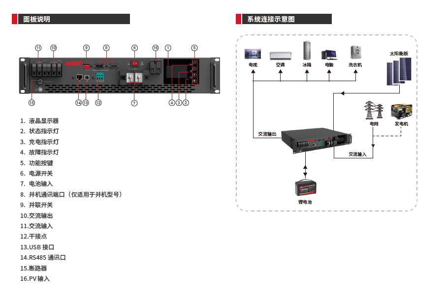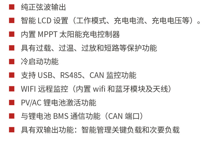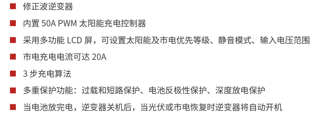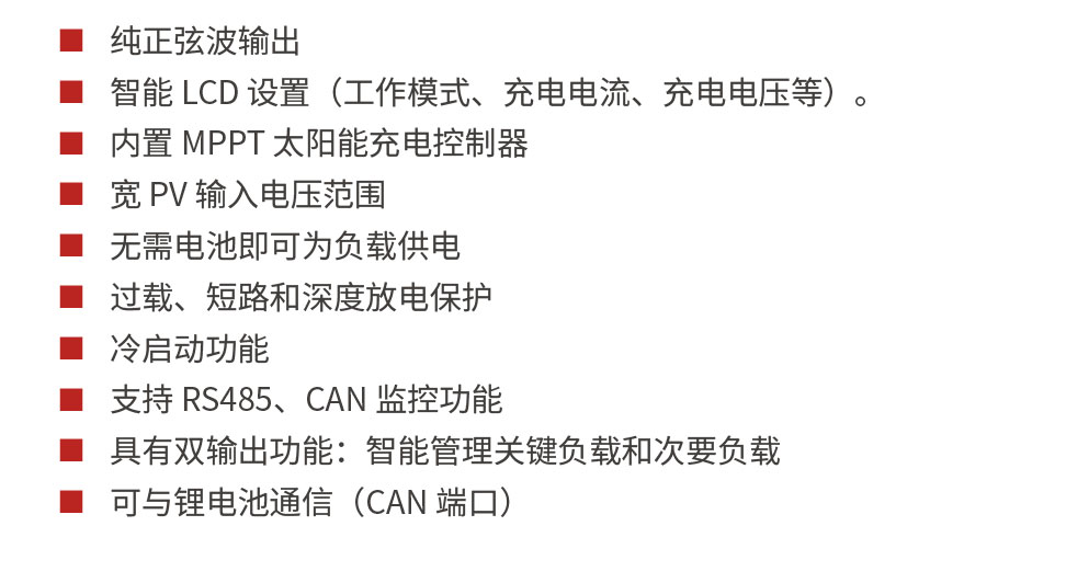 - 具有多模式設(shè)置功能,可通過(guò)LCD 屏選擇設(shè)置光伏、市電、電池的優(yōu)先等