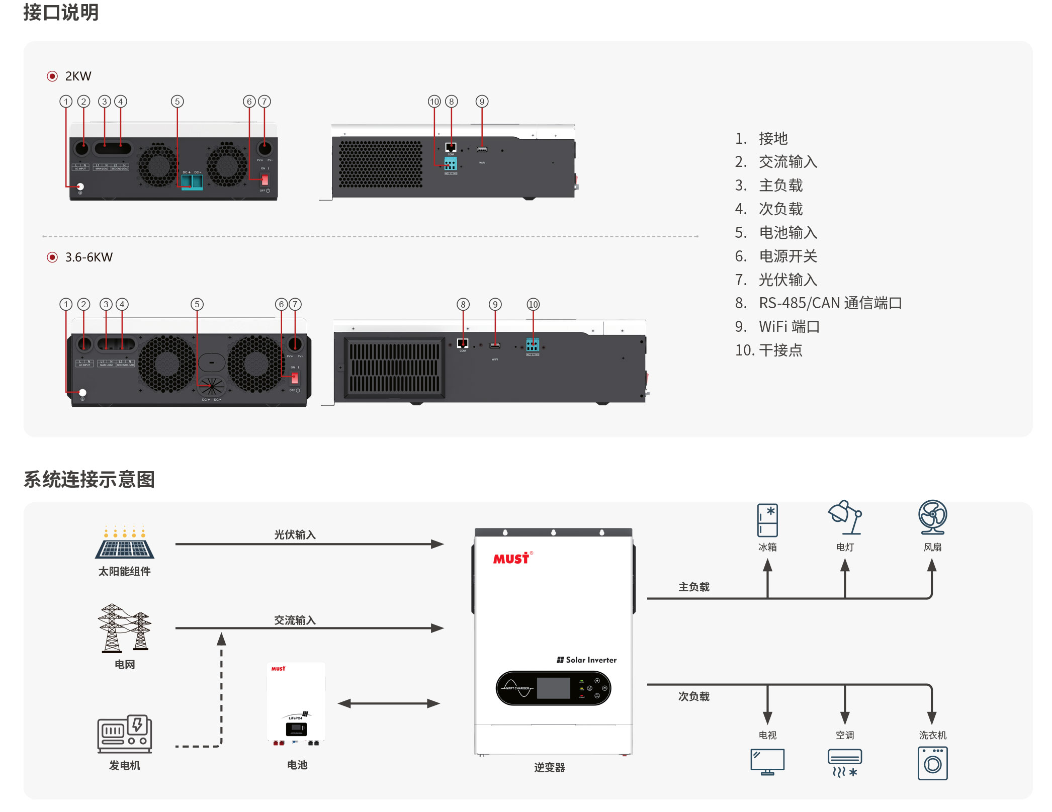- 當(dāng)電池放完電,逆變器關(guān)機(jī)后,當(dāng)光伏或市電恢復(fù)時(shí)逆變器將自動(dòng)開(kāi)機(jī)