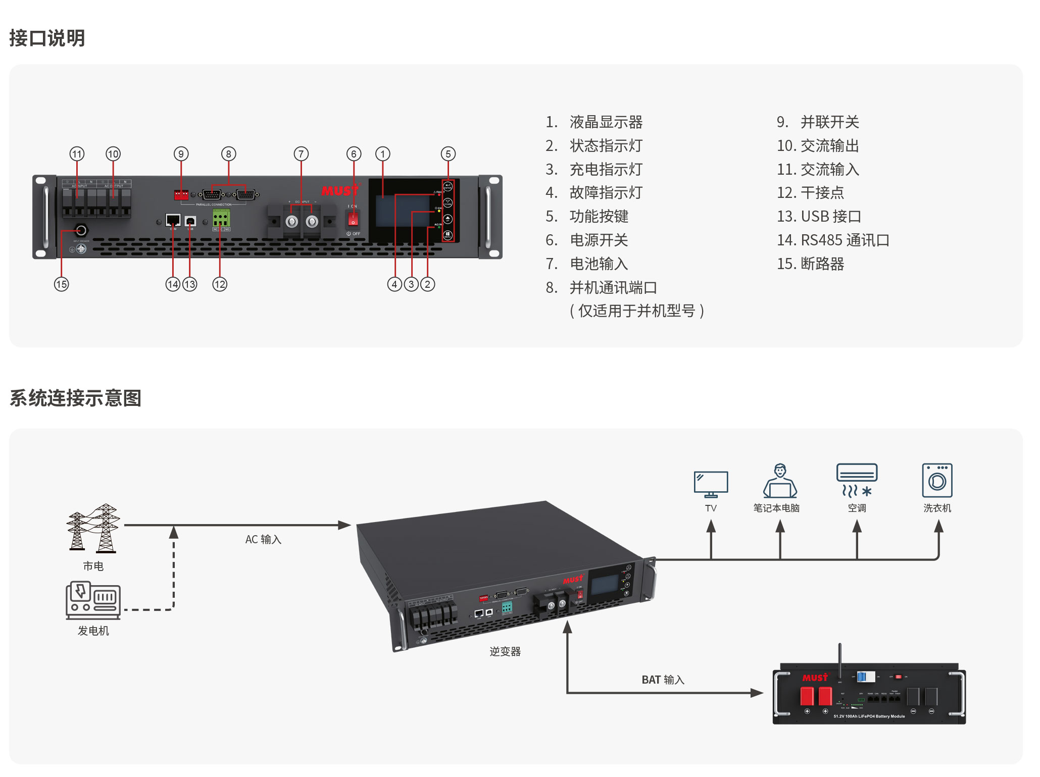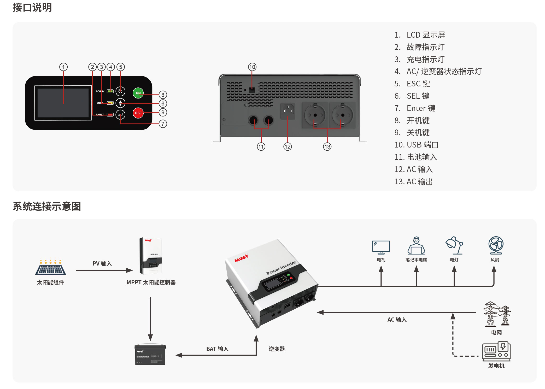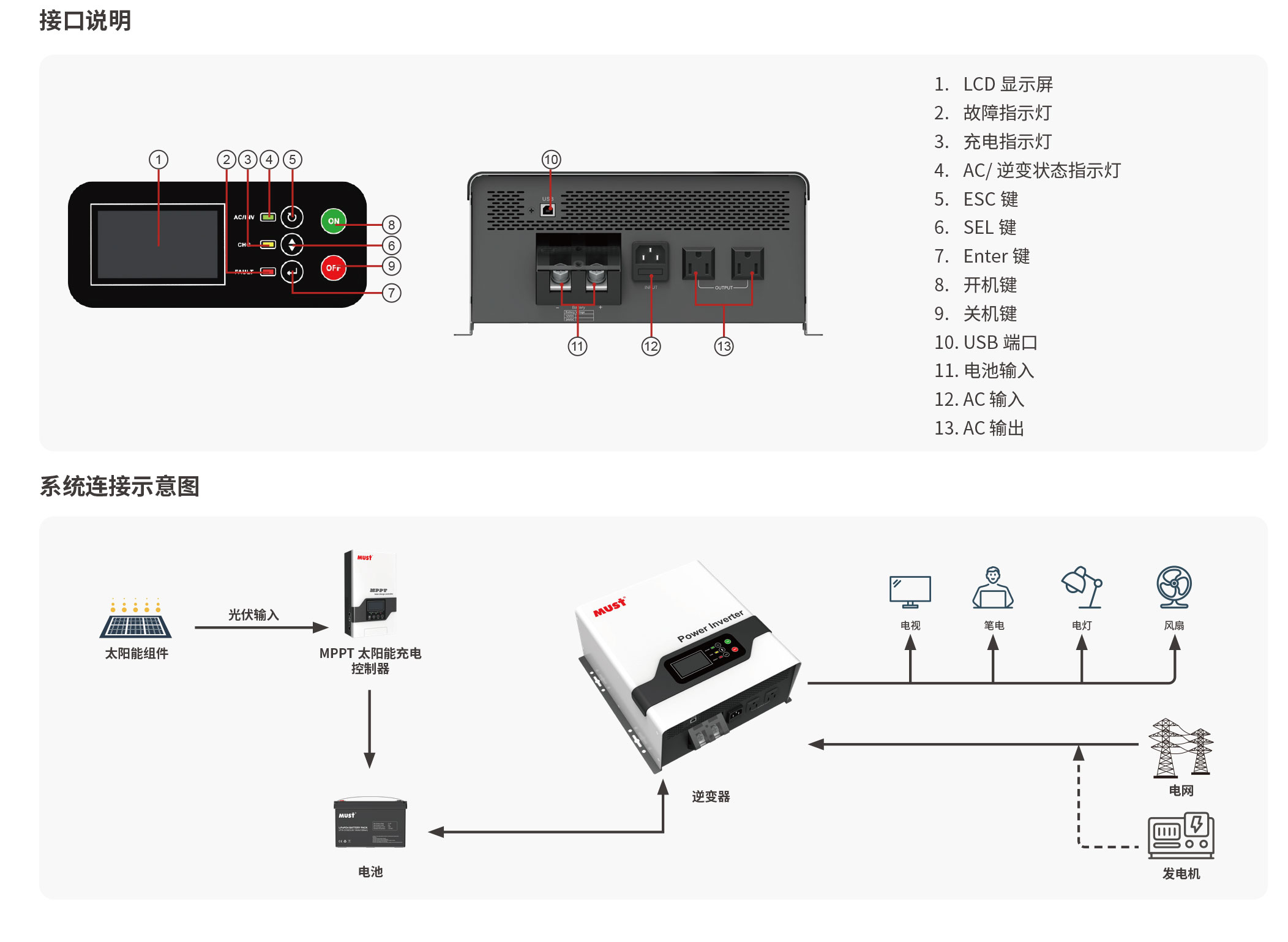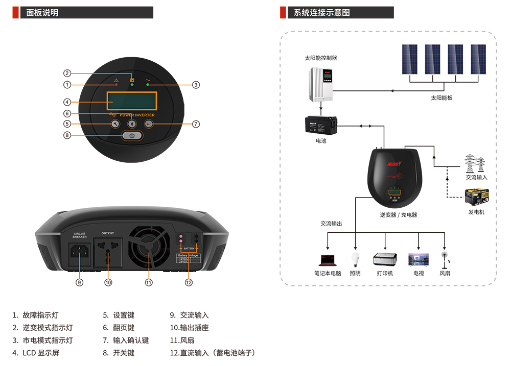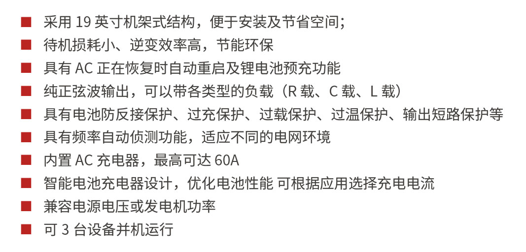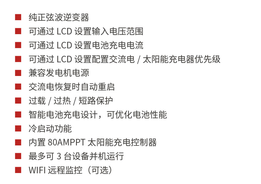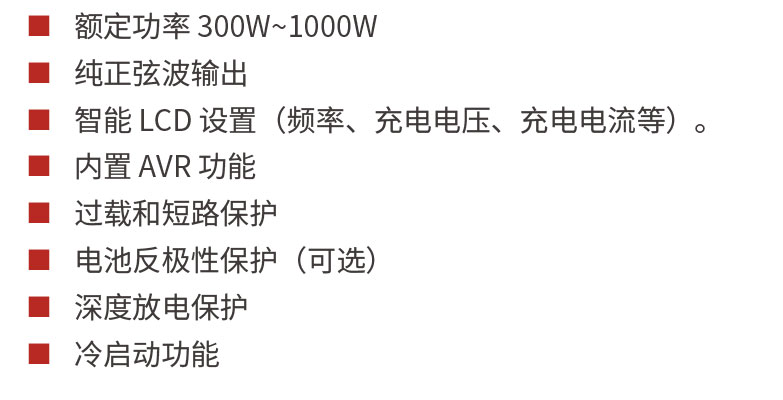 - 市電異常、電池放電至關(guān)機、市電恢復正常后逆變器將自動啟動、實現(xiàn)無人值守功能