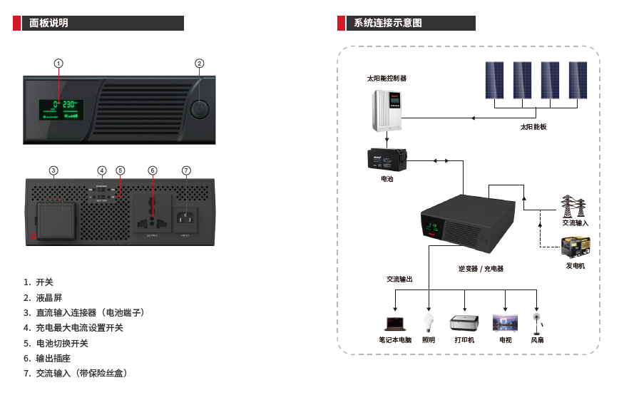 - 具有較寬的市電輸入電壓范圍,可通過LCD 進行選擇、滿足不同用電需求